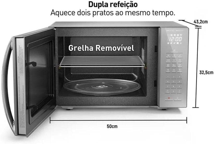 O Panasonic inibe até 99,9% da proliferação das bactérias, pois tem revestimento antimicrobiano. Design Sofisticado Agora a linha está ainda mais moderna e sofisticada, com um novo painel. Dupla Refeição. Sabe quando você vai almoçar com alguém e precisa esperar um prato ficar pronto para esquentar o outro? Com uma grelha removível, a função pode ser ativada para aquecer 300g, 500g e 700g (peso total de duas porções) em pratos diferentes. Para aproveitar, basta colocar uma refeição no prato giratório e outra na grelha. Pega Fácil. Sabe quando você vai aquecer algo em uma xícara e, quando o micro-ondas para, ela está no fundo do aparelho, com a asa virada para trás? Pega Fácil resolve para você. Assim que o aquecimento termina, o prato faz uma rotação para que você pegue o utensílio exatamente onde deixou.